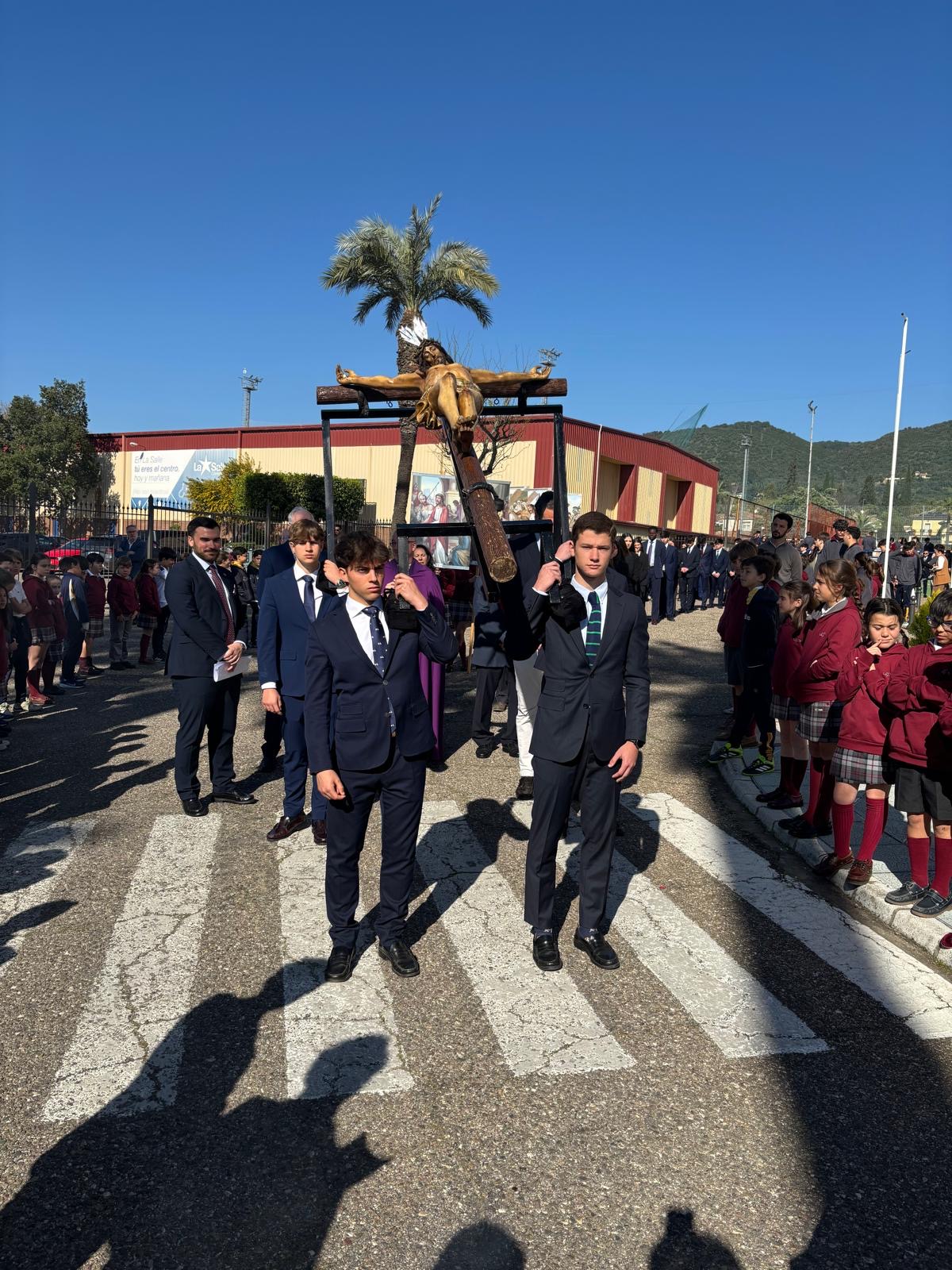 Uno de los momentos más emotivos de la jornada fue la participación de los alumnos de 2º de Bachillerato, quienes, con responsabilidad y respeto, tuvieron el honor de portar al Señor crucificado durante el recorrido. Su implicación y actitud ejemplar dieron un especial realce a la celebración, convirtiéndose en testimonio vivo de fe y compromiso.